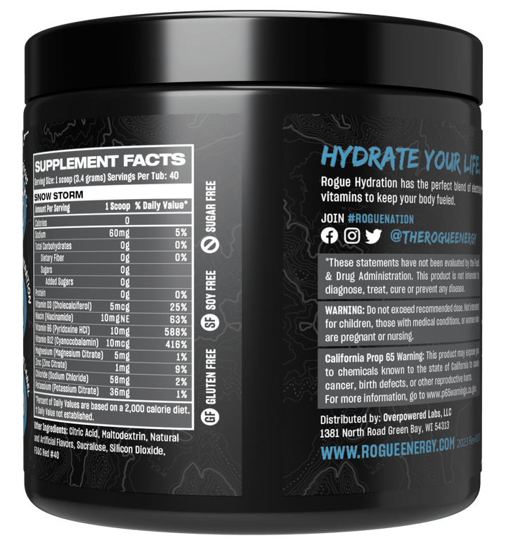 Rogue Hydration Gamer Drink Snow Storm Tub Label And Nutrition Facts